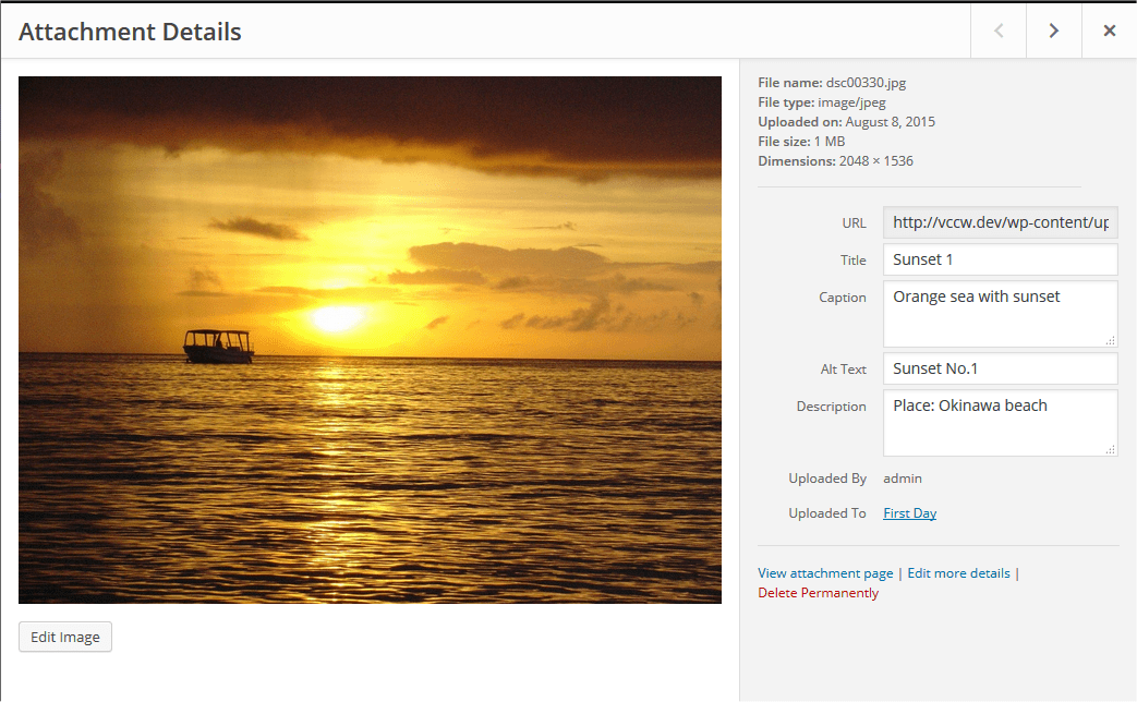 - Uploaded To – Title of the Post or Page that contains this Media. Click on the title to view that Post or Page in an edit Screen. If the Media was unattached to any Post or Page, this line does not appear.