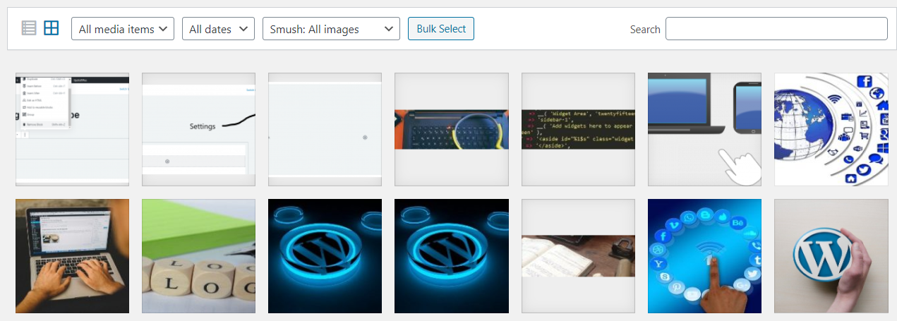 As you can see from the screenshot below In Media Library Grid View, thumbnails of image, Audio icons and Movie icons are arranged in the grid.