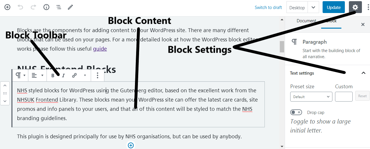 Each block consists of a Block Toolbar, a Block Settings Sidebar and the Block Content. Blocks are divided into three sections: Block Toolbar, Block Settings Sidebar, and Block Content. Please see image below: