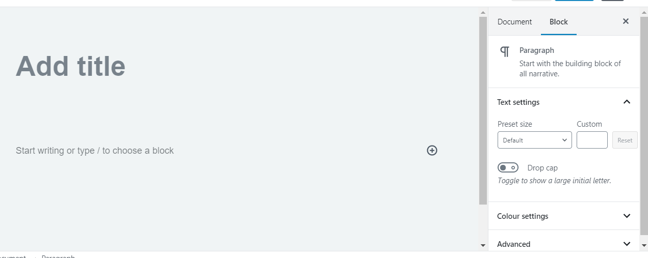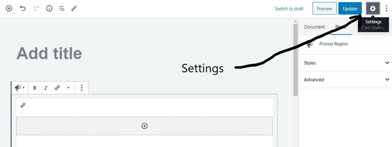 The Document Settings is where you can add tags and categories, choose a featured image, see and change the status of your post, and more — these are options that apply to the page or post as a whole.
