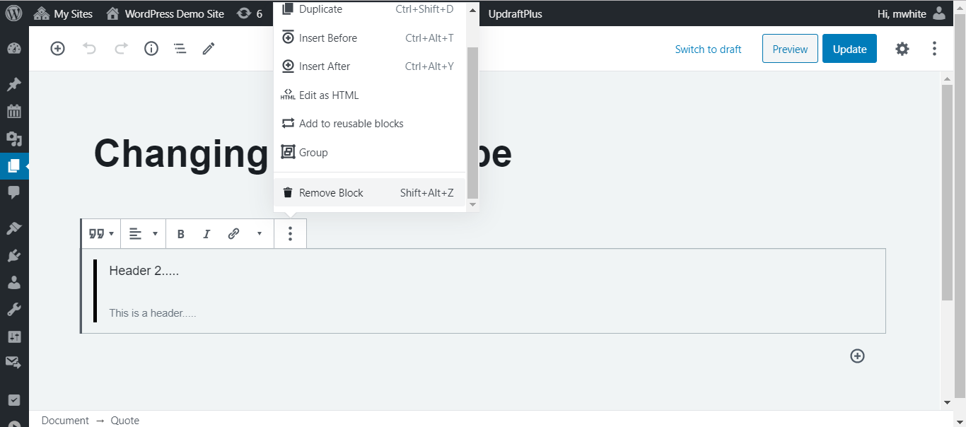 What if you’d like to change a block type? No problem: you can transform each block to another similar or related block type. For example, change a paragraph to a heading, a list, or a quote.